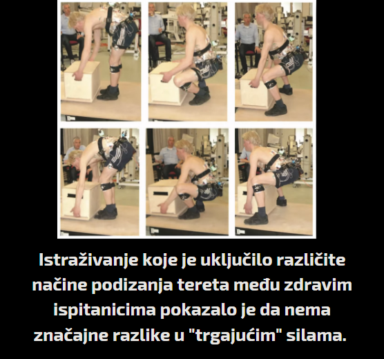 Kada pričamo o podizanju tereta, kod jednog poznatog istraživanja ispitivane su različite tehnike dizanja opterećenja u ZDRAVIH ispitanika.. Rezultati su pokazali kako nema značajne razlike između tehnika podizanja što se tiče sječnih sila tj. ”shearing forces” na kralježnicu. Zapravo, iako nema značajnih razlika, upravo ”weightlifting” stil podizanja proizveo je najviše takve sile – što ne znači da je opasan, već to možemo gledati kao najefektivniji način jačanja, ako baš želimo u detalj.